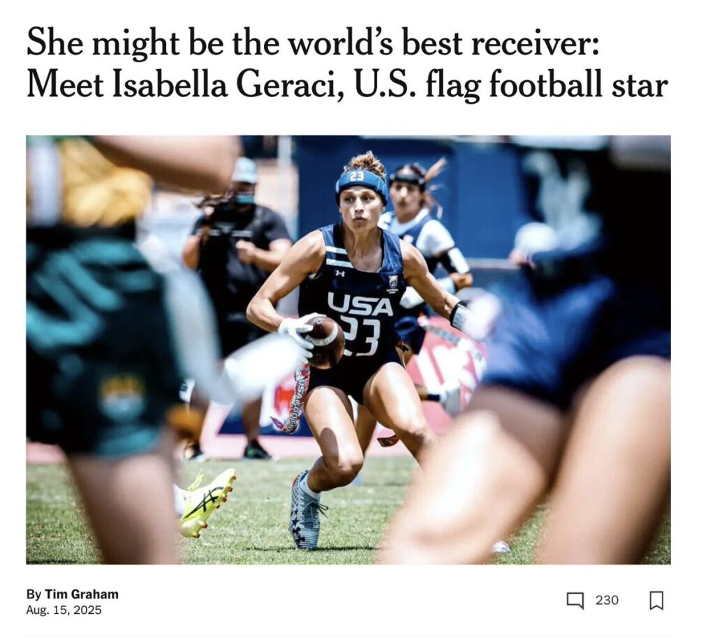 I pray she never leaves flag football. She may very well be the best flag football receiver, big leap to full contact. Having played both forms of football I will say leave flag cautiously to go into full contact. A middle linebacker could be a very rude awakening.